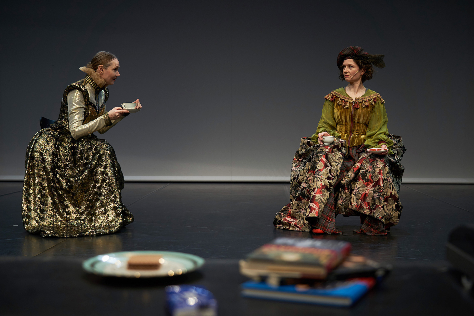 Zwei Schauspielerinnen werfen sich in opulente, königliche Renaissancekleider und spielen mögliche Antworten auf diese Frage durch. Sie spielen zwei ebenso machtvolle wie unterschiedliche Frauen, zwei ungewöhnliche weibliche Lebenswege in männlichen Machtapparaten. Zwischen Vertrauen und Misstrauen, immer auf Messers Schneide, könnte eine Nähe entstanden sein, überraschend für beide. Oder wird Grace als irische Rebellin verhaftet und hingerichtet?